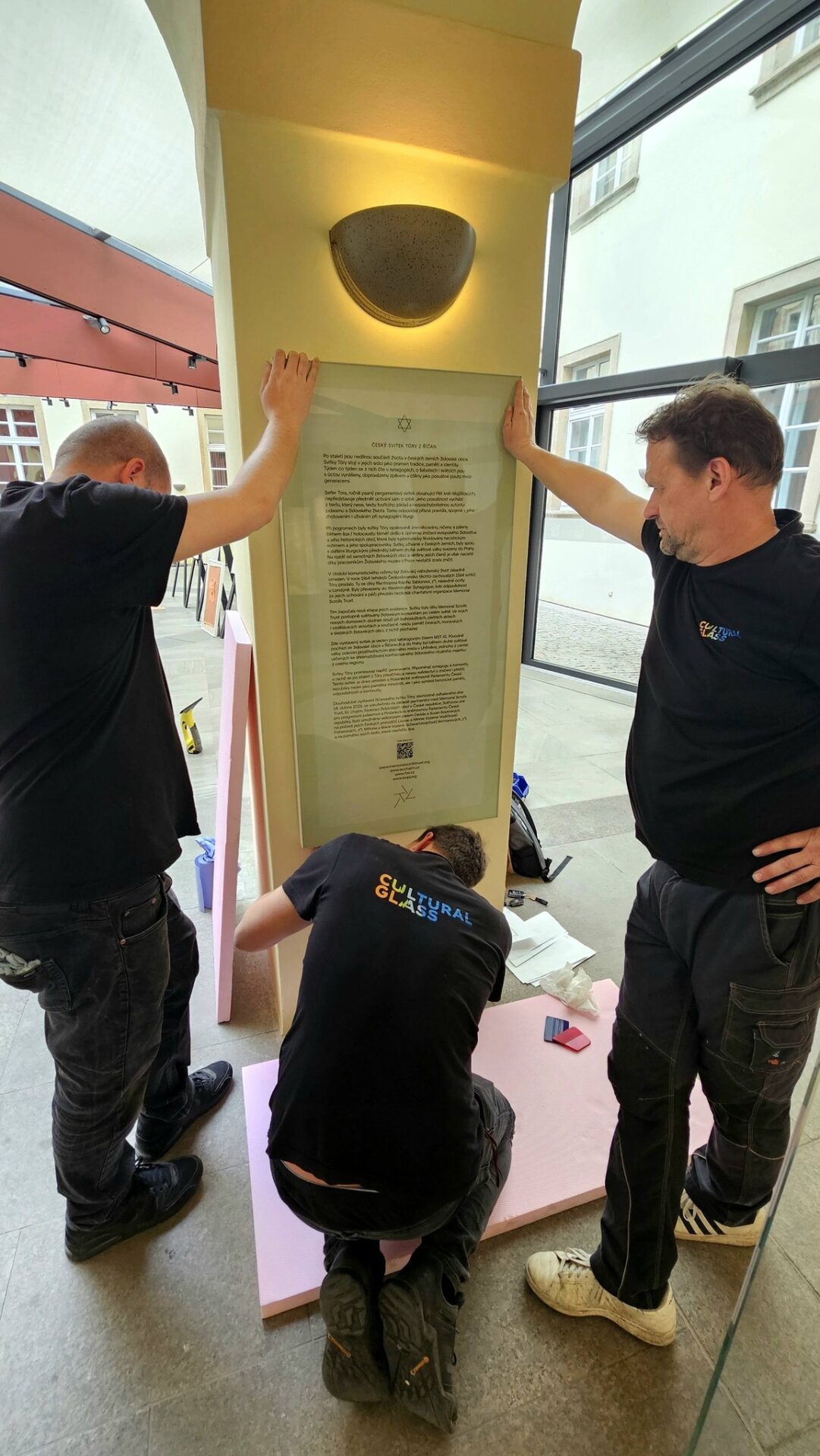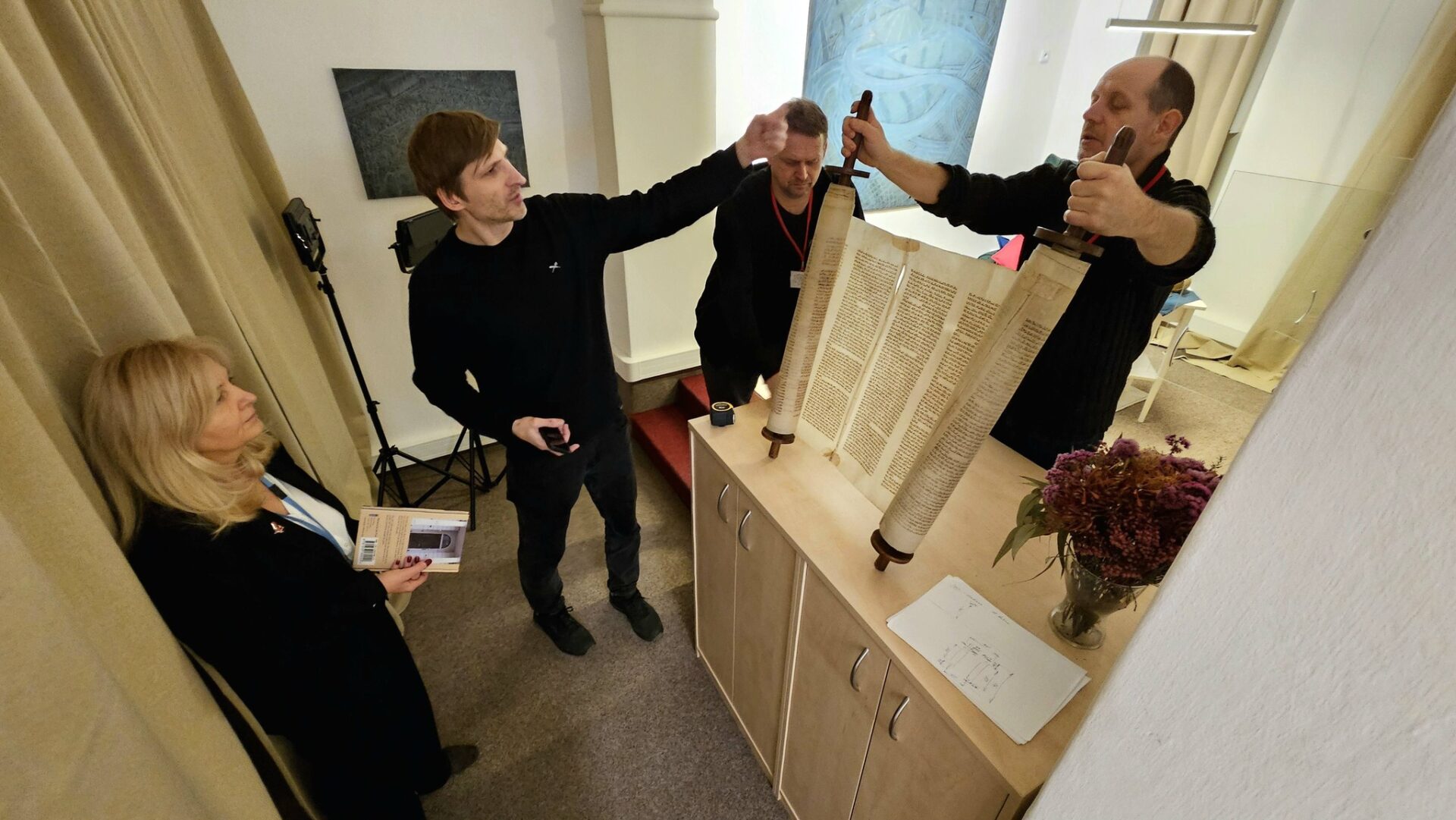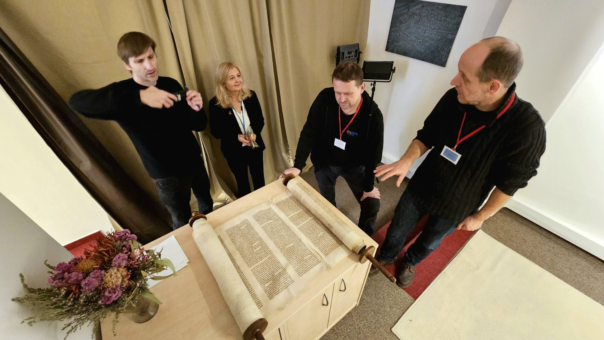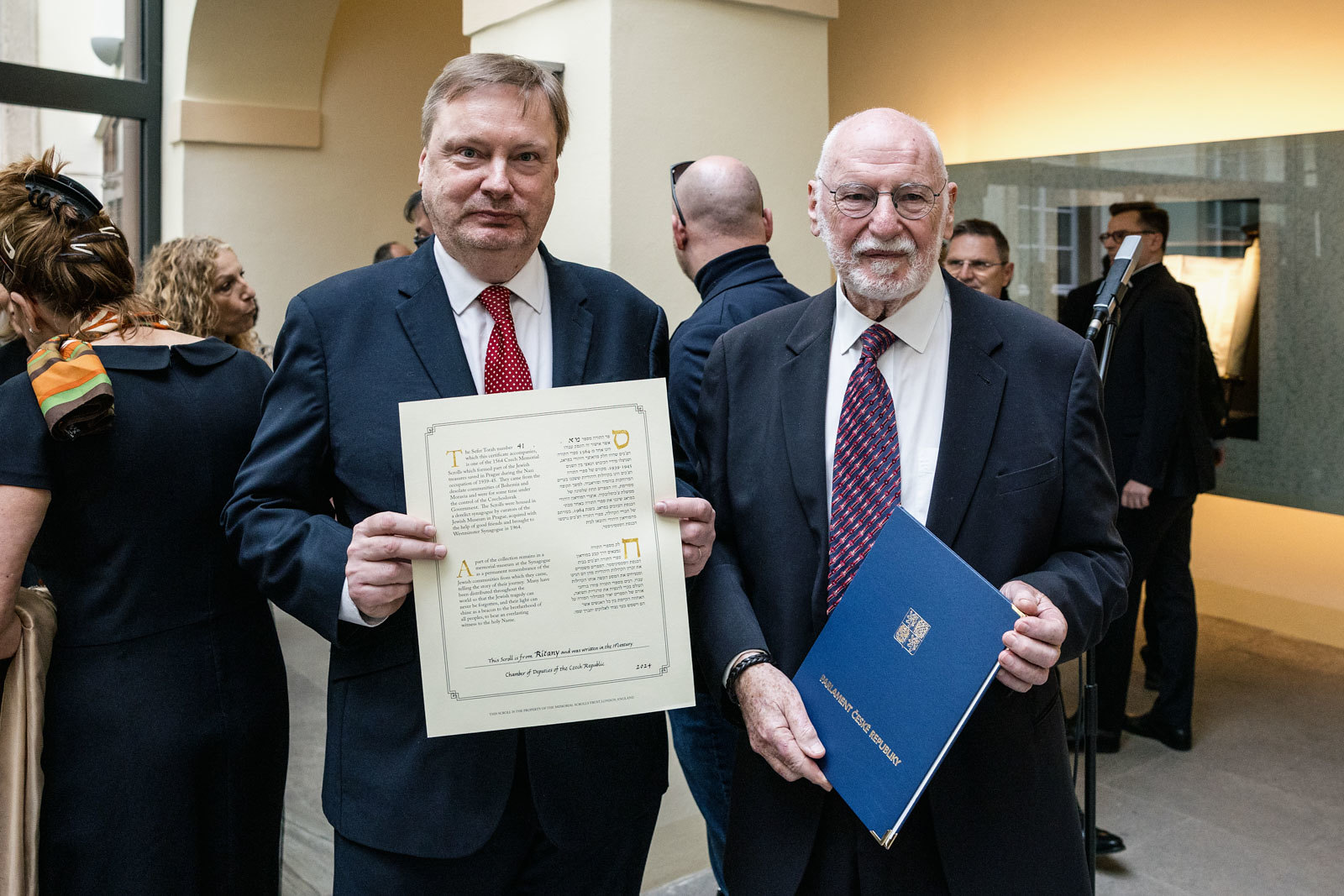 Svitek Tóry z Říčan, původně připisovaný Uhříněvsi, se dostal do Sněmovny po dlouhém úsilí dvou a půl roku. Vystavovali jsme jej spolu s příběhem záchrany před rokem a něco a nyní dostal svou trvalou schránku ve Dvoraně Šternberského paláce. V říčanské modlitebně byly kdysi tři svitky, dva jsou ještě živé a ten náš ze Sněmovny je už neživý. Máme jej jako připomínku spoluobčanů, kteří se nedožili dneška, neměli děti a nejsou po nich vnuci. A pro svět politického soupeření máme svitek jako připomínku hodnoty svobody, pro kterou je třeba usilovně pracovat. A motiv na schráně: Rozpadlá Davidova hvězda na špejličky zve k tomu, abychom ji zase složili…